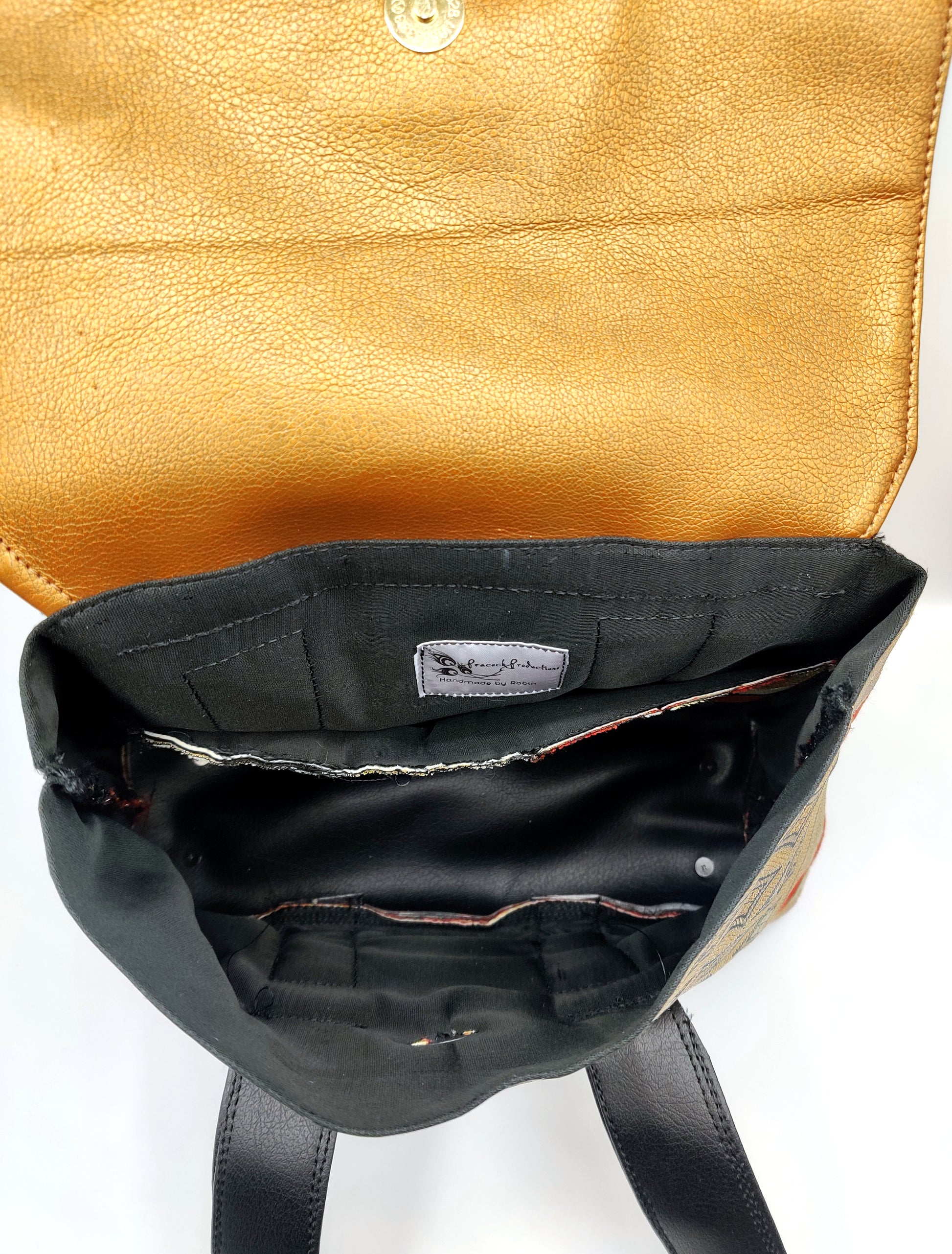 Handmade handbag featuring 100% silk Japanese kimono obi belt fabric and contrasting handle and flap in black vinyl. Bag colors are orange, gold, black, white and green. Interior patch pocket and snap closure. This chic statement bag is unique and one-of-a-kind. Lightweight and easy to wear, this handbag keeps your essentials close. My bags are meticulously handmade and made from upcycled materials.