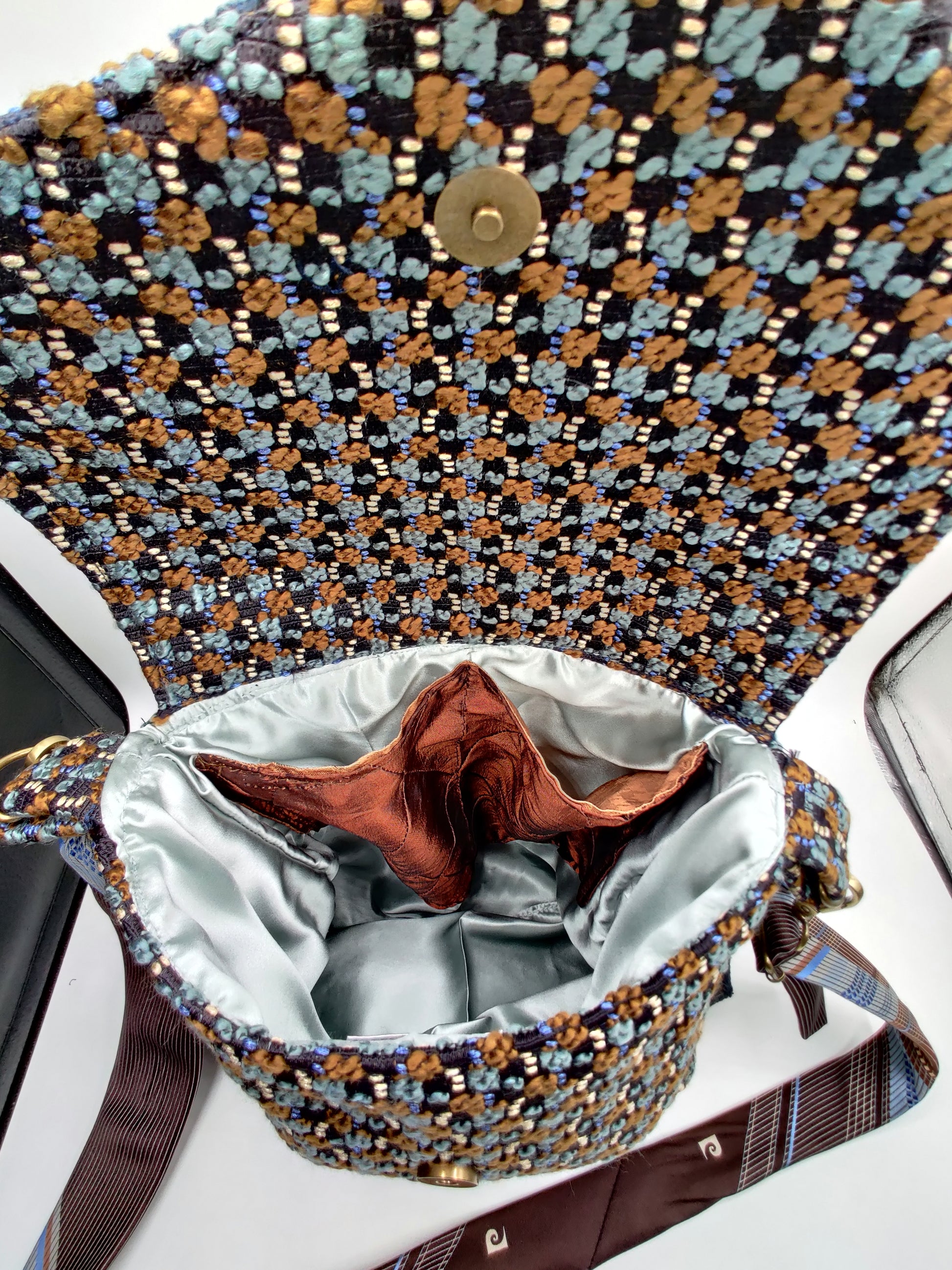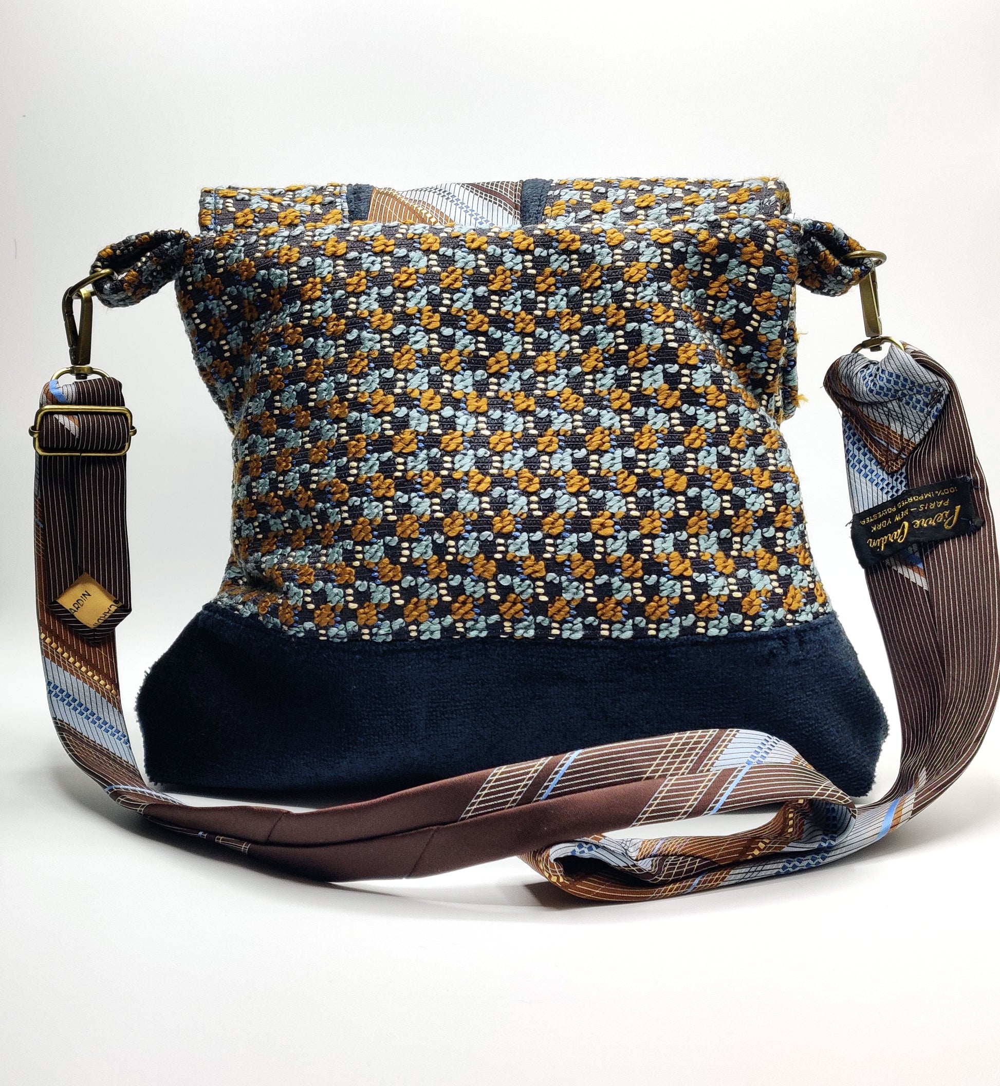 Handmade messenger style shoulder bag featuring navy, light blue, and gold checkered tweed fabric and contrast lower panel in navy blue chenille. Adjustable strap made from vintage Pierre Cardin tie. Bag colors are navy, light blue, gold, and brown checkered tweed pattern. Two interior patch pockets and snap closure. Interior lining made with pale blue satin fabric. Brass hardware including 1" snap hook swivel clasp. Lightweight and easy to wear with its adjustable strap, this crossbody bag keeps your essentials close and your hands free. My bags are meticulously handmade, unique and one-of-a-kind made from upcycled materials.