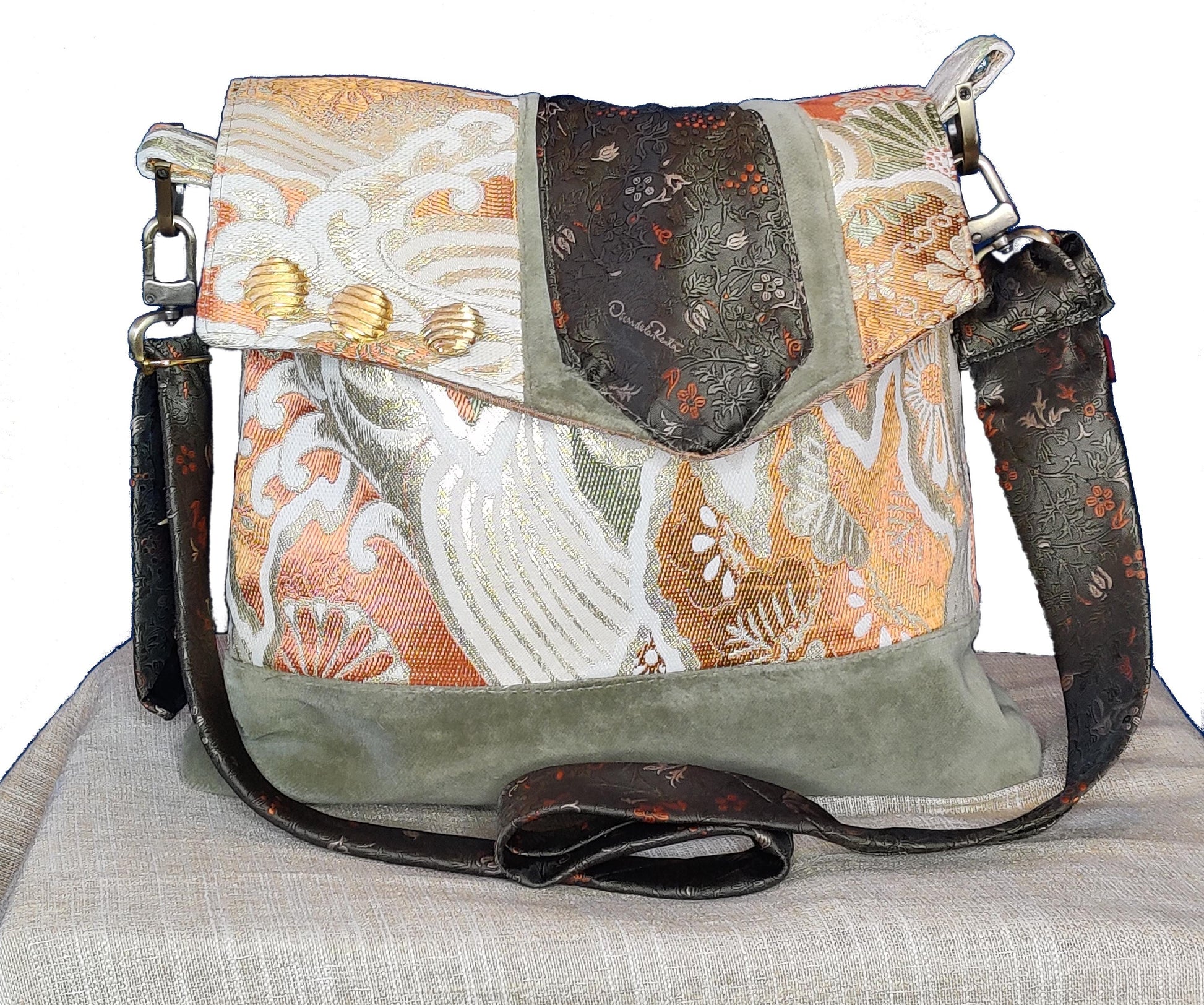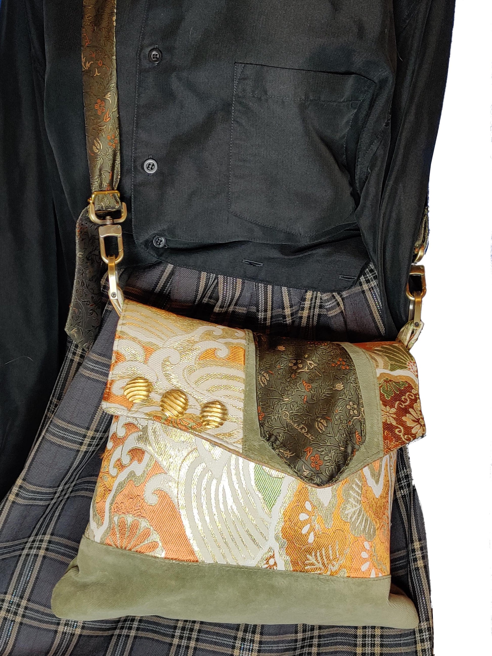 Handmade messenger style shoulder bag featuring Japanese obi belt kimono fabric with wave print (in orange, white, green, and gold) and contrast lower panel in sage green chenille. Adjustable strap made from vintage Oscar de la Renta tie. Bag colors are gold, orange, bronze and sage green. Two interior patch pockets and snap closure. Brass hardware including 1" snap hook swivel clasp. Lightweight and easy to wear with its adjustable strap, this crossbody keeps your essentials close and your hands free. My bags are meticulously handmade, unique and one-of-a-kind made from upcycled materials.