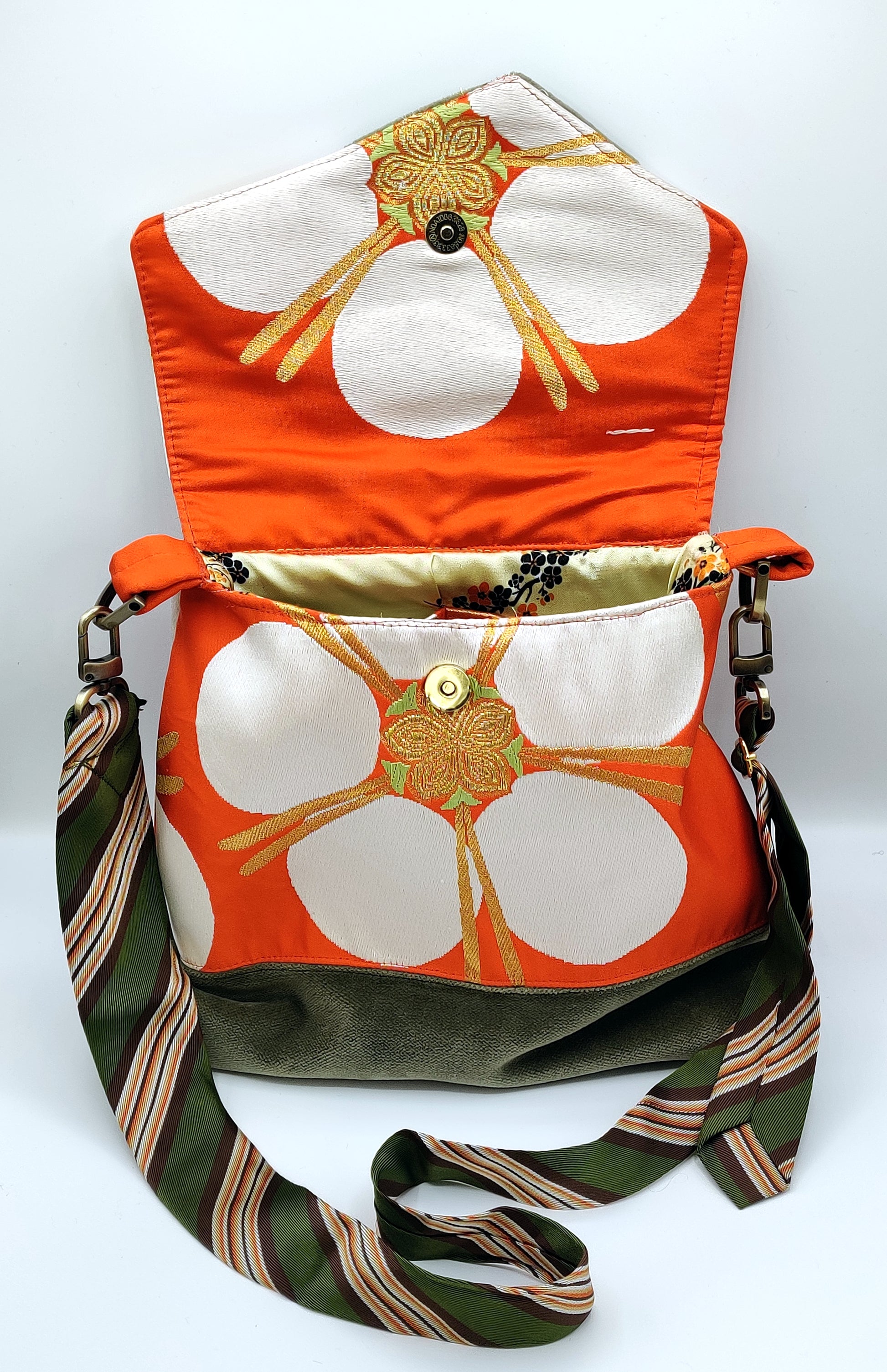 Handmade messenger style shoulder bag featuring 100% silk Japanese obi belt kimono fabric with orange and white cherry blossom pattern and contrasting lower panel in sage green chenille. Adjustable strap made from vintage tie. Bag colors are gold, orange, white and green. Two interior patch pockets and snap closure. Interior lining made with yellow satin fabric with cherry blossom print. Brass hardware including 1" snap hook swivel clasp. Lightweight and easy to wear with its adjustable strap, this crossbody keeps your essentials close and your hands free. My bags are meticulously handmade, unique and one-of-a-kind made from upcycled materials.