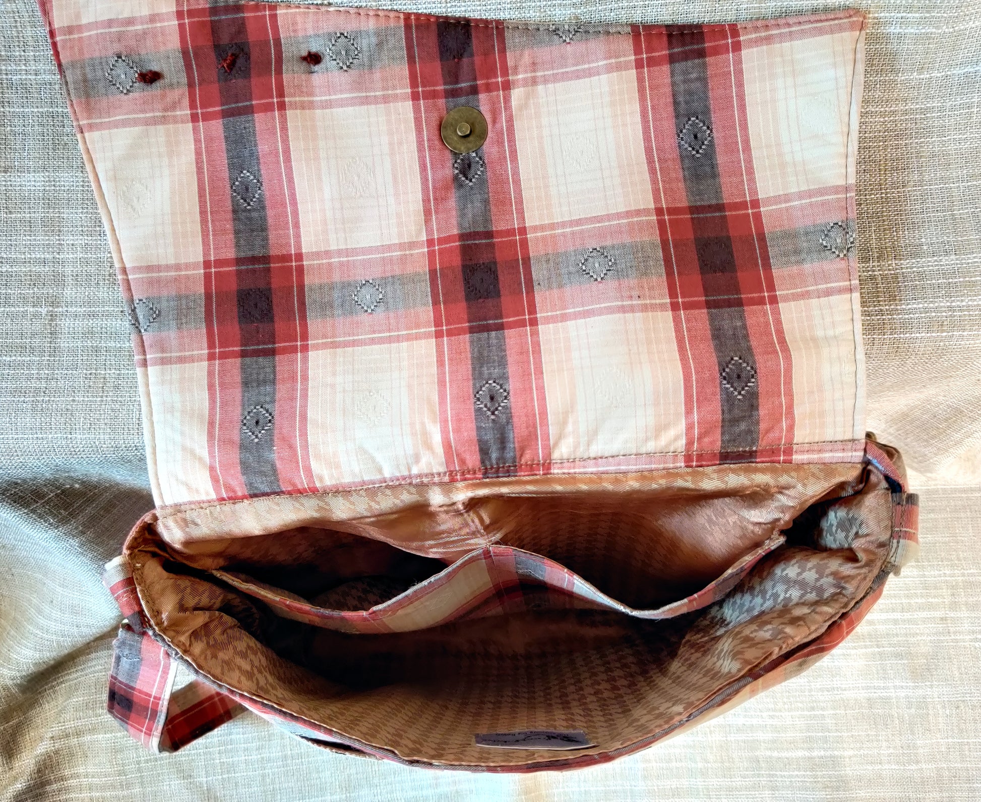 Handmade retro western style purse featuring an asymmetrical flap and front pocket. Colors are orange, brown, and cream plaid fabric with contrasting guitar print. One functional pocket on the front, two interior patch pockets and snap closure. Interior lining made with beige houndstooth jacquard fabric. Adjustable strap with brass hardware including 1" snap hook swivel clasp. Lightweight and easy to wear with its adjustable strap, this crossbody keeps your essentials close and your hands free. My bags are meticulously handmade, unique and one-of-a-kind made from upcycled materials.