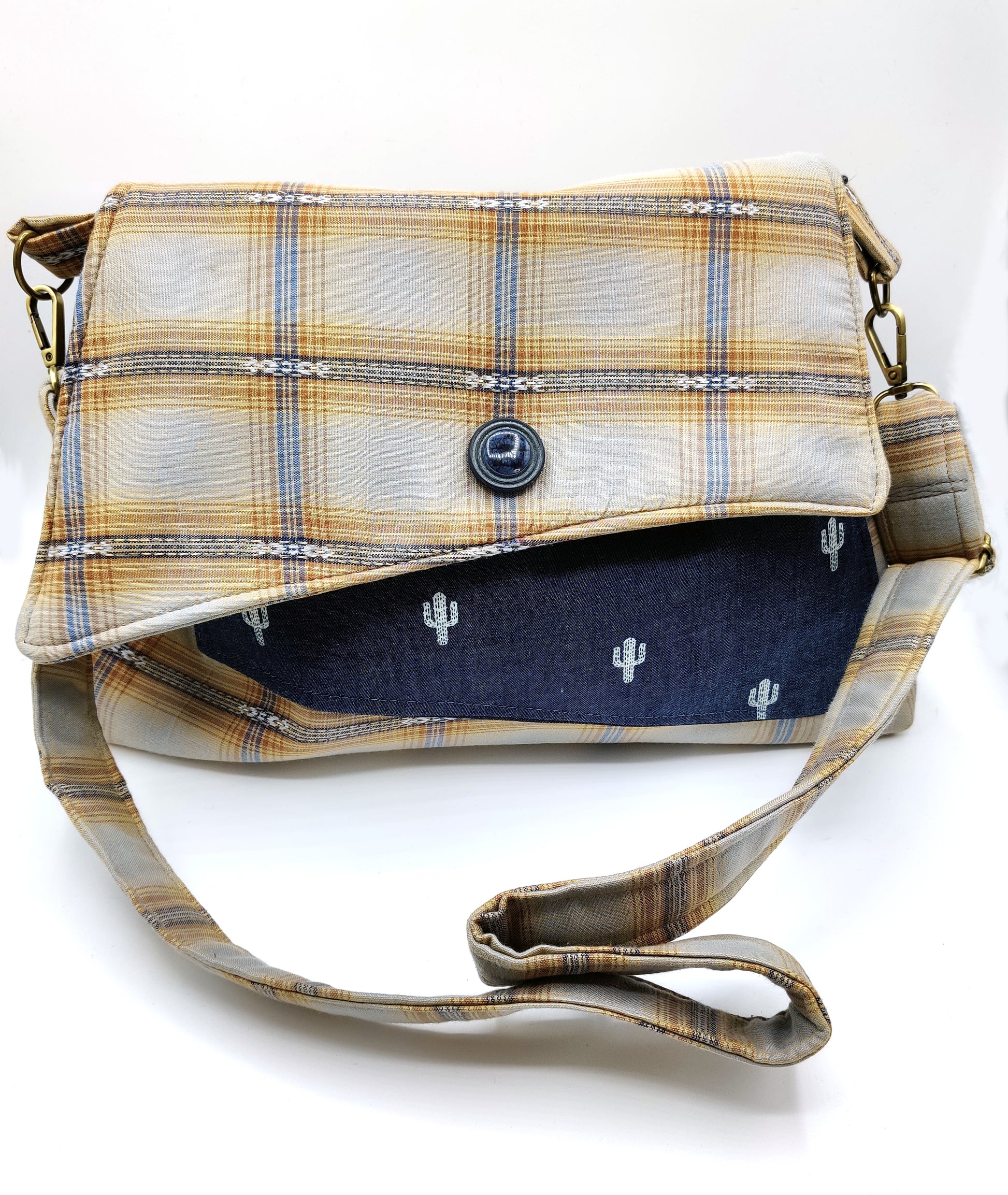 Handmade retro western style purse featuring an asymmetrical flap and front pocket. Colors are brown, blue and cream plaid fabric with contrasting Saguaro cactus blue jean print. One functional pocket on the front, two interior patch pockets and snap closure. Adjustable strap with brass hardware including 1" snap hook swivel clasp. Lightweight and easy to wear with its adjustable strap, this crossbody keeps your essentials close and your hands free. My bags are meticulously handmade, unique and one-of-a-kind made from upcycled materials.